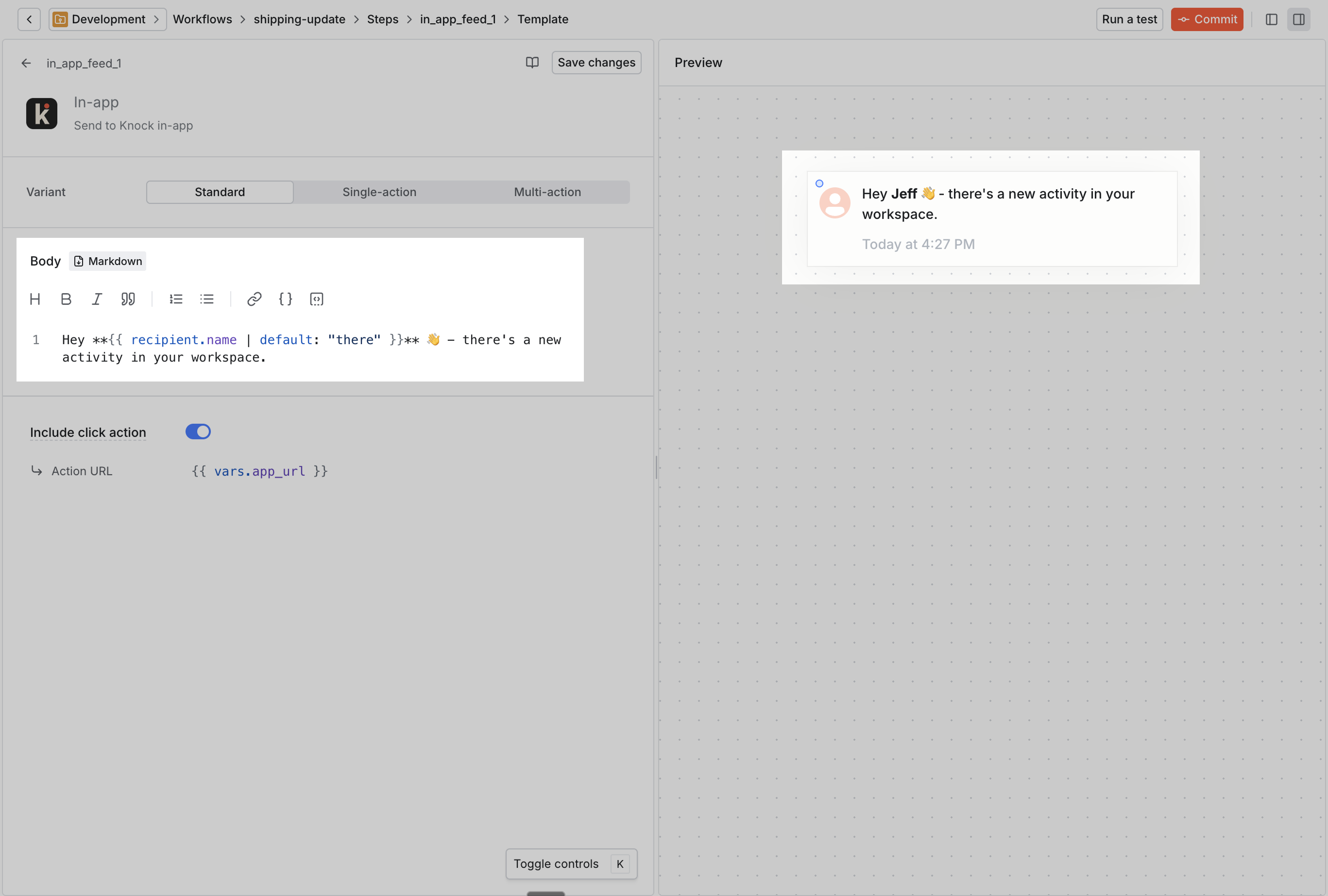 In the example below, we trigger the knock-quickstart workflow for the user we identified with the feed.